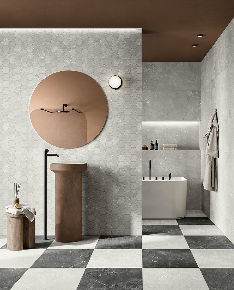 Chic and versatile, the Horizons porcelain tile collection combines concrete and stone for a sleek, contemporary look. Modern neutrals and minimalist graphics make for a timeless collection. With sizes ranging from hexagon mosaics to large format panels, Horizons is the perfect finishing touch for floors or walls.