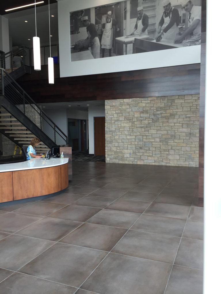 - Keramos 32” x 32” Sparta in main lobby with Keramos 2” x 2” Sparta mosaic in kitchenette.