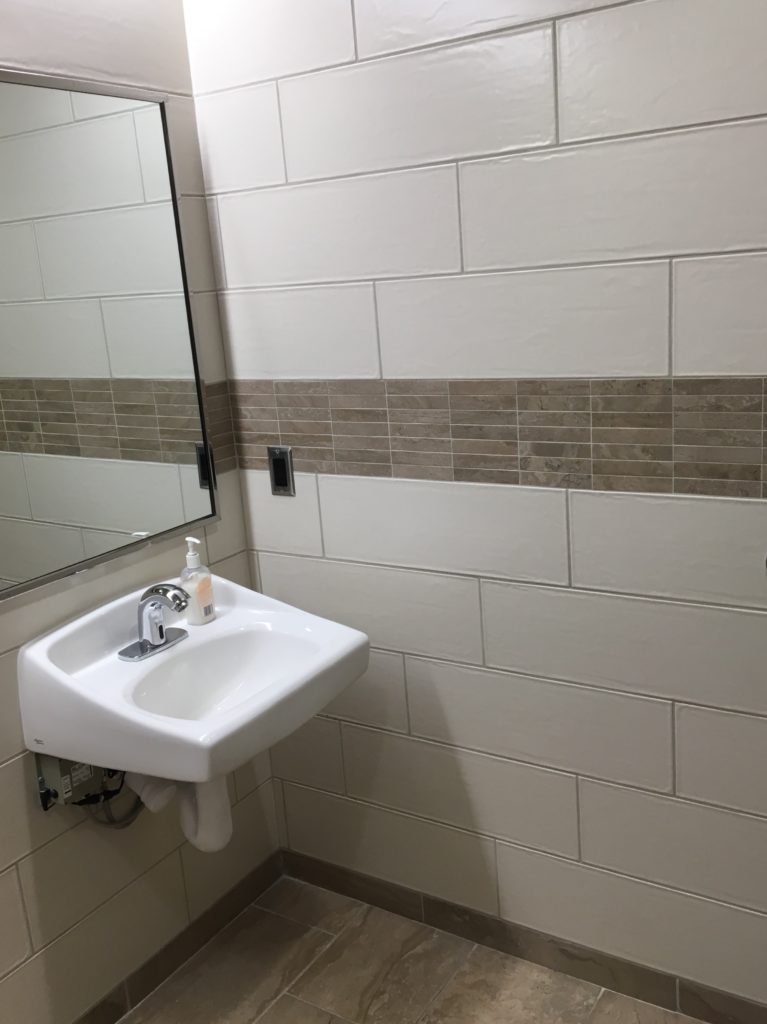 - Spa Stones 12” x 24” Beige on restroom floor with Smooth 4” x 24” Bone wall tile and Spa Stones 1” x 6” Beige mosaic accent on restroom walls